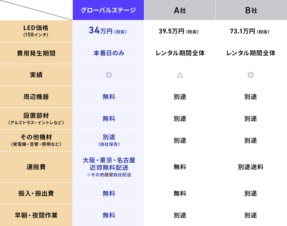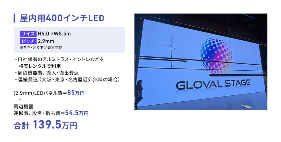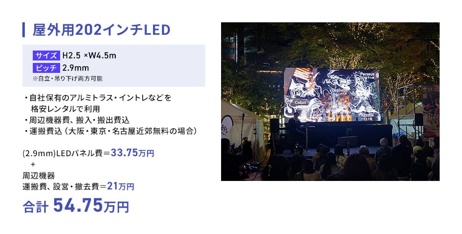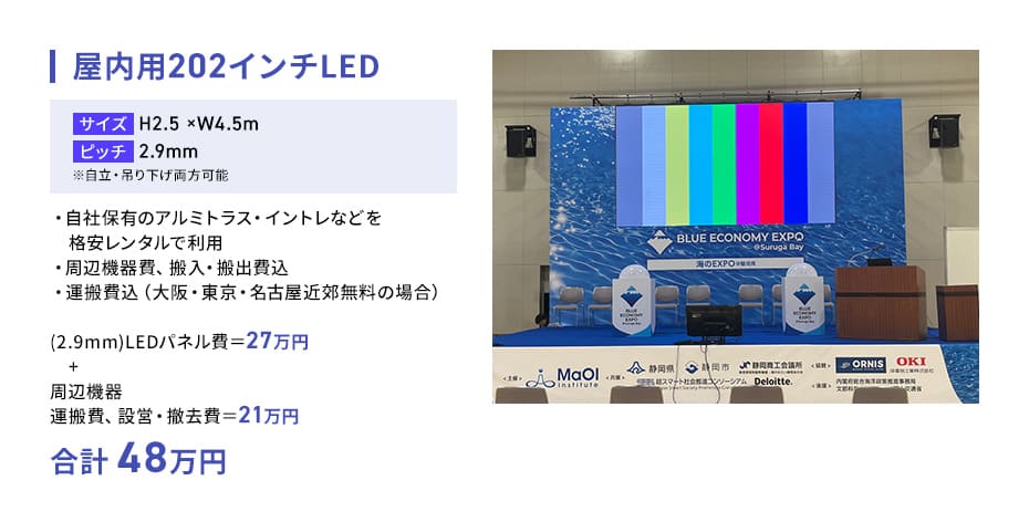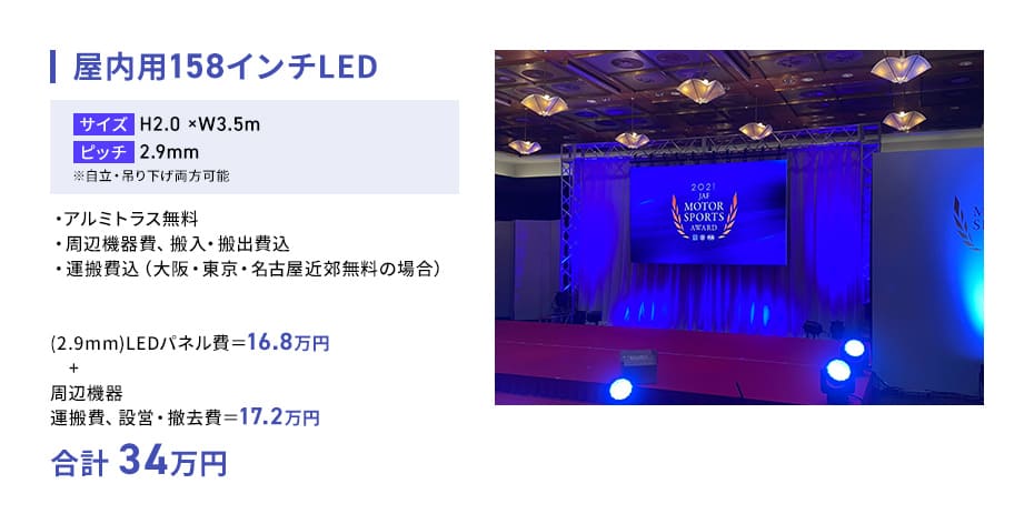 158インチLEDを、アルミトランス無料、周辺機器費、運搬費、搬入・搬出費、設営費込で34万円(税抜)からでご提供しております。
