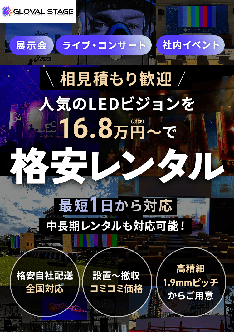 グローバルステージでは、イベントや目的に応じた最適なLEDのご提案から、配送・設置・施工・撤収まで、一貫してサポートいたします。